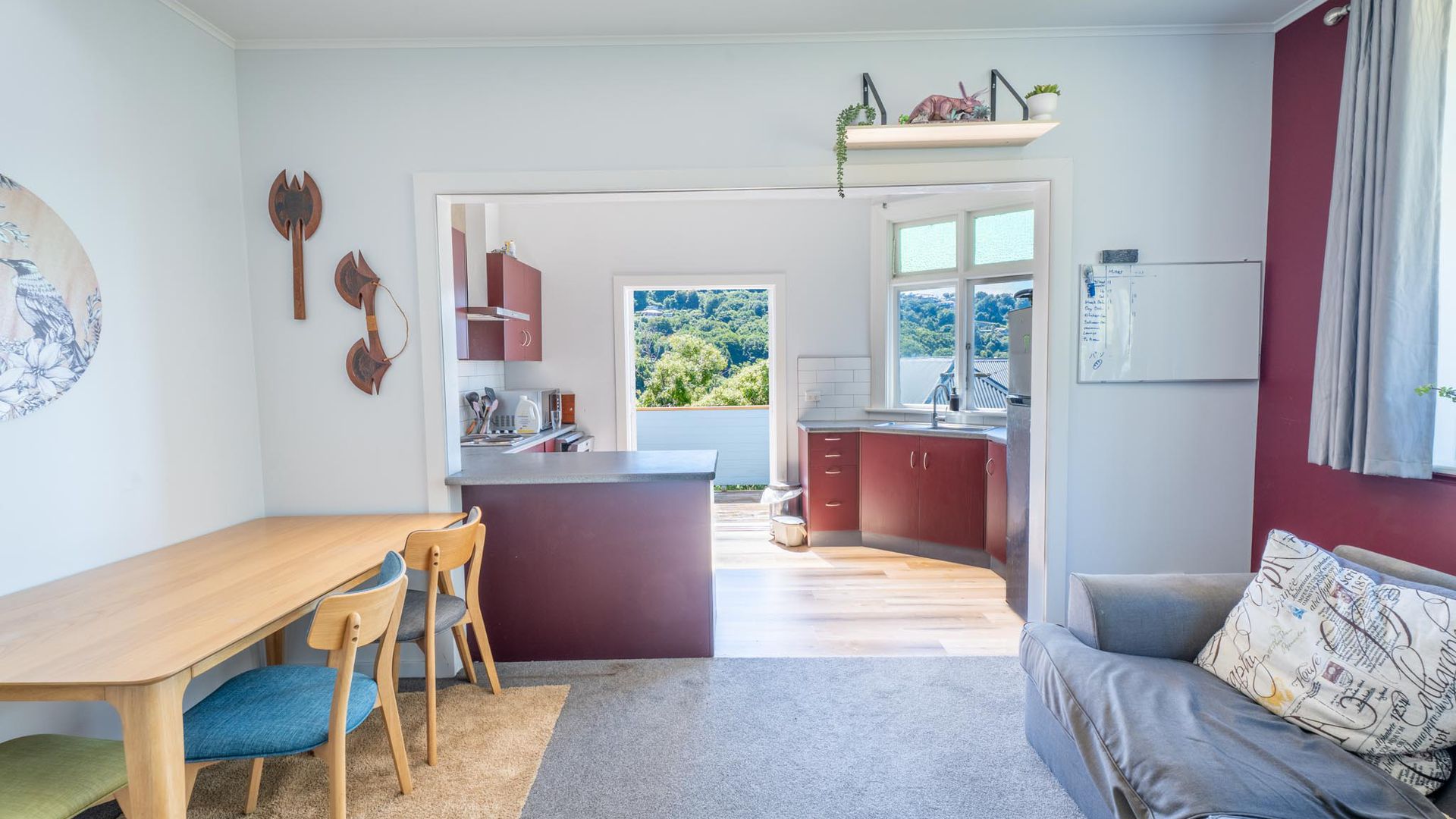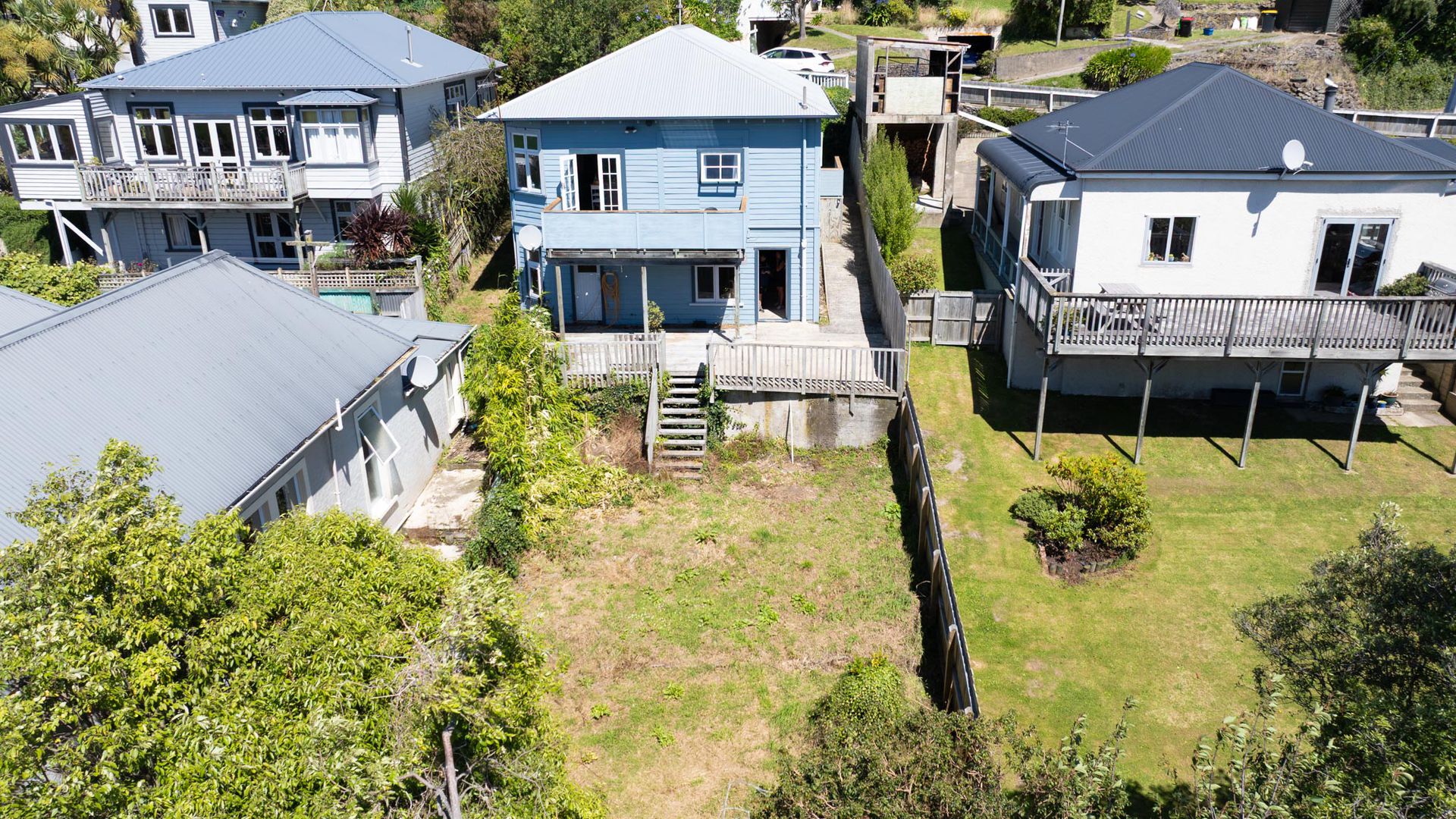 - Outdoors: A courtyard leads to steps down into a sunny, grassed backyard.