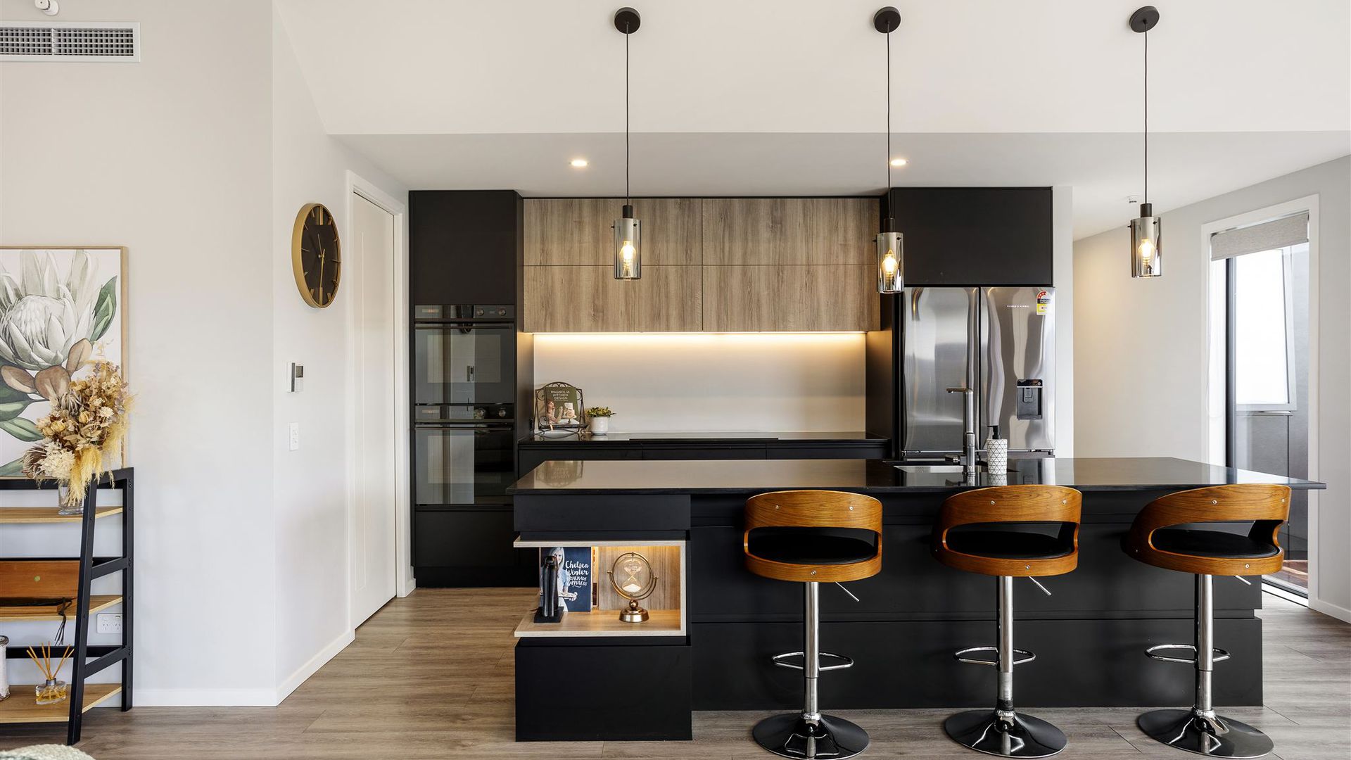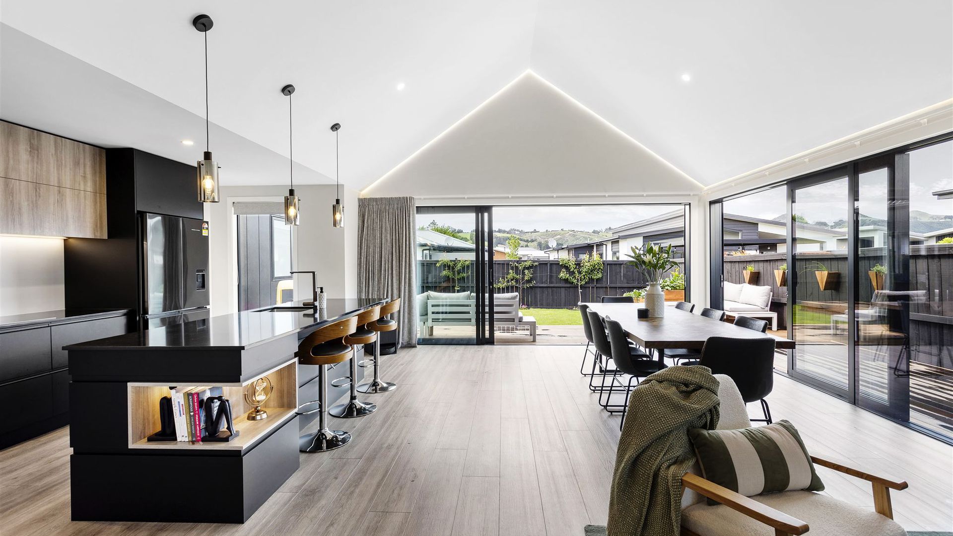 Step inside and be welcomed by soaring ceilings and a spacious open-plan living, dining, and kitchen area. The sleek, contemporary kitchen features a large island, high-end finishes, and a walk-in pantry—ideal for entertainers and busy households alike. Two sets of stacking doors open seamlessly to the sun-soaked deck and BBQ area, perfect for summer gatherings and easy indoor–outdoor living.