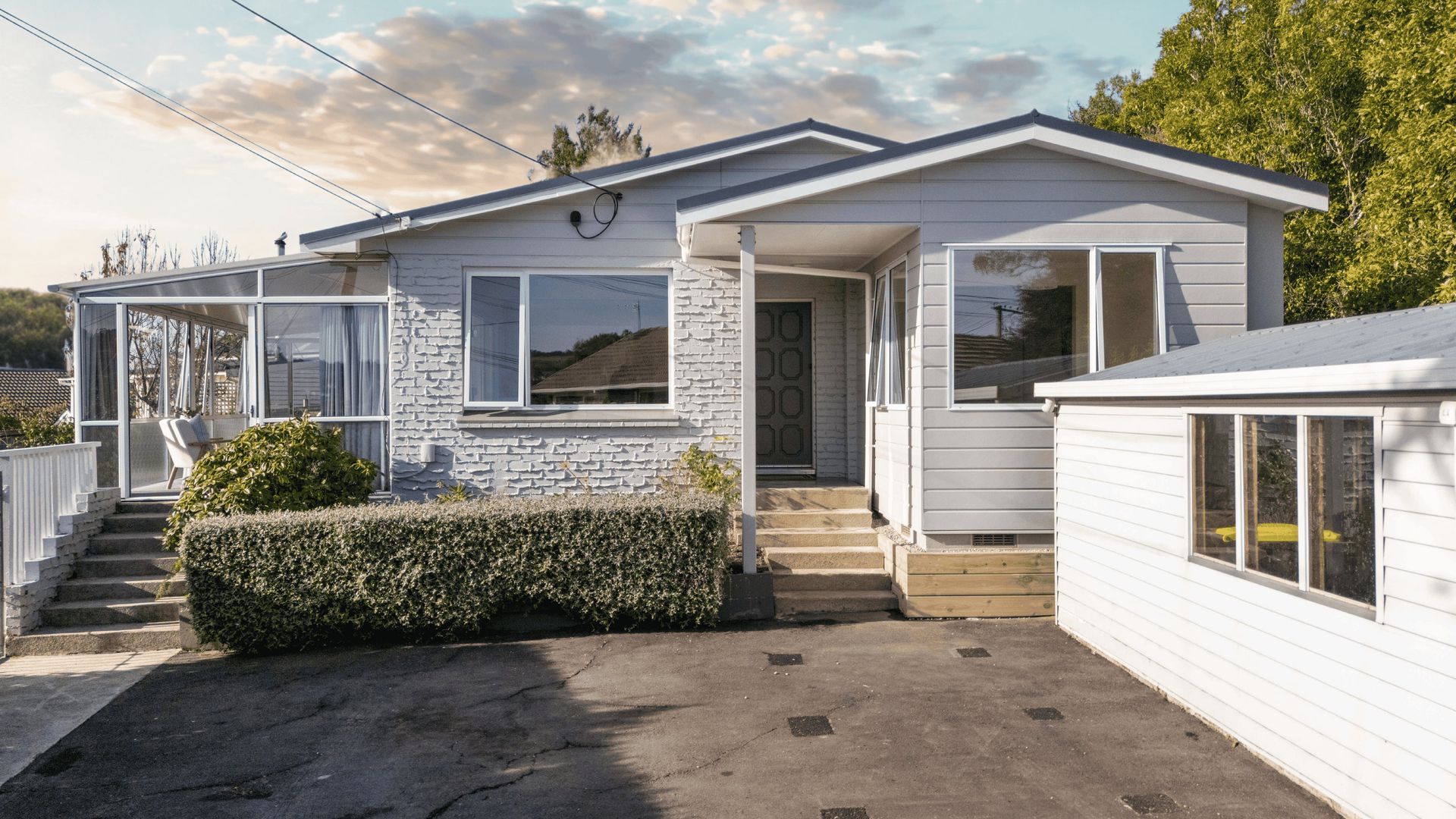 Step inside to discover a modern, open-plan kitchen and dining area that flows seamlessly into the conservatory-style living space. Sliding doors offer flexible indoor-outdoor living, either opening into the private, sun-soaked yard or out to the front of the property with sliding doors providing easy access to off-street parking.